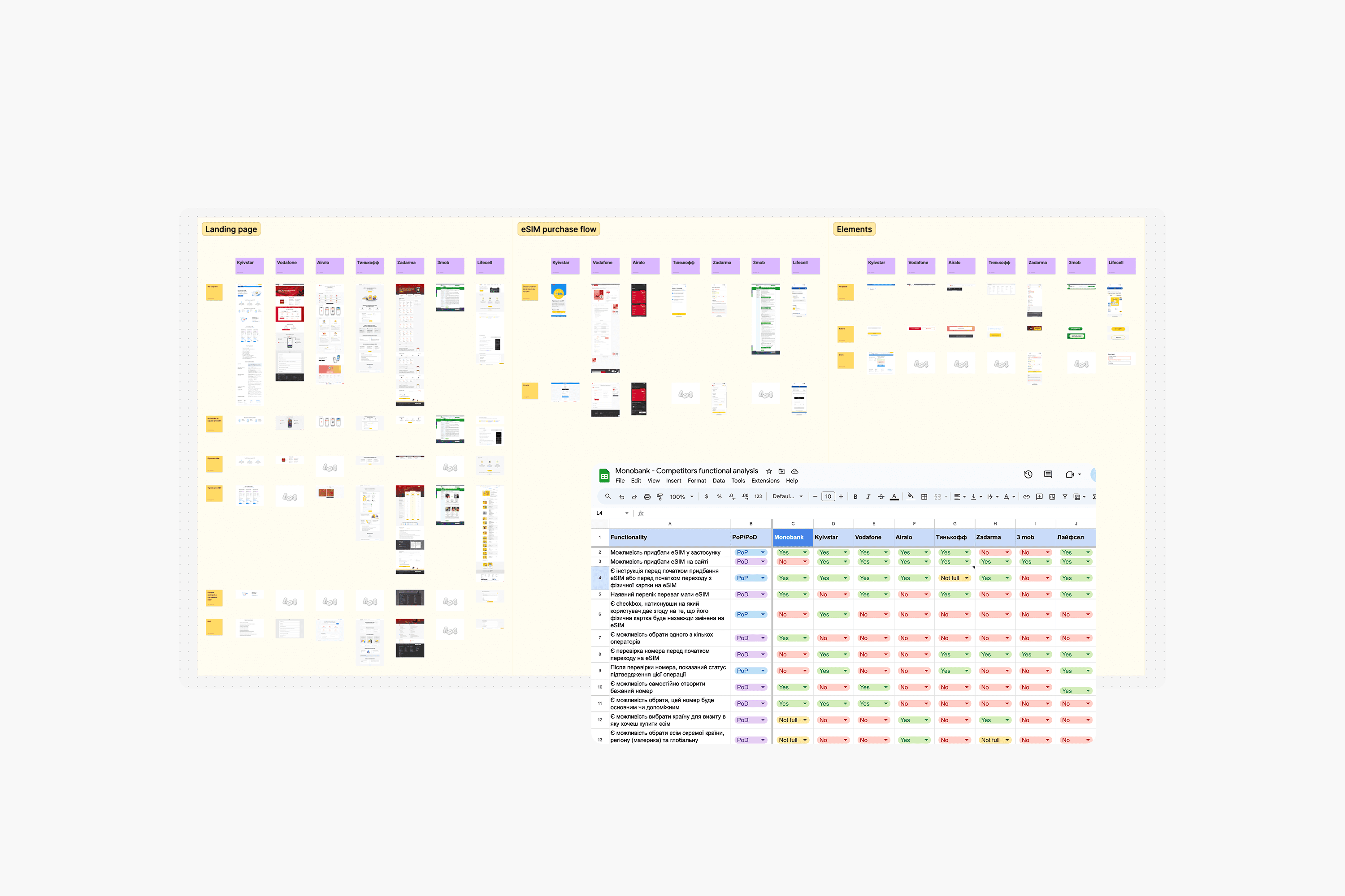 Our competitive analysis focused on examining 7 key competitors. We assessed their strengths and weaknesses to establish benchmarks for our design. Additionally, we analyzed UI patterns and functional attributes, allowing us to identify points of parity and difference relative to Monobank.